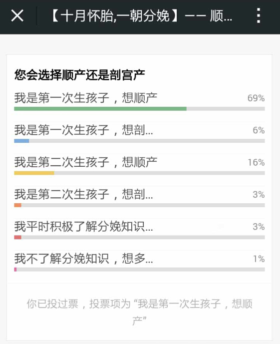 10月23号,小编发起了顺or剖小调查,截止今天,有85%的参与投票的准妈妈选择“我想顺产”,另外,也有准妈妈表示希望多了解些关于分娩的知识。