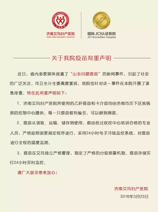 近日,关于“山东问题疫苗”新闻事件,引发全社会广泛关注,特别是婴幼儿家长更为关注和担忧。作为专业服务母婴群体的医疗机构,济南艾玛妇产医院非常理解为人父母的紧张心情,院方对此高度重视,第时间组织人员对我院的疫苗开展了严格自查。