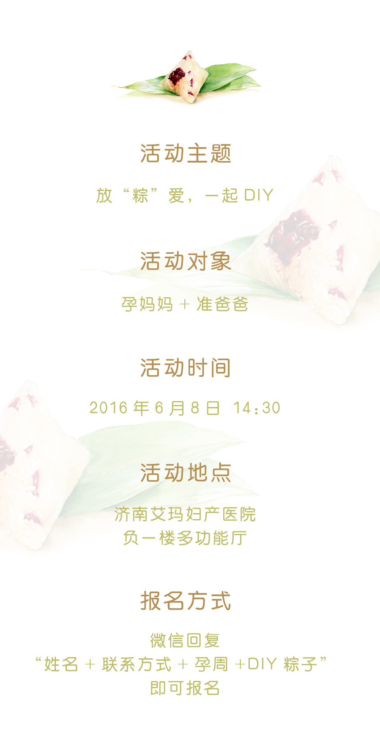 亲爱的孕妈咪们,想不想亲手“捏”只粽子君?6月8日(端午节前天)下午,为了迎接即将到来的端午佳节,我们隆重推出洋溢着暖暖亲情的端午特别活动,带孕妈准爸们起DIY粽子君,尝尝自己亲手制作的粽子,定别有番甜蜜在心头。