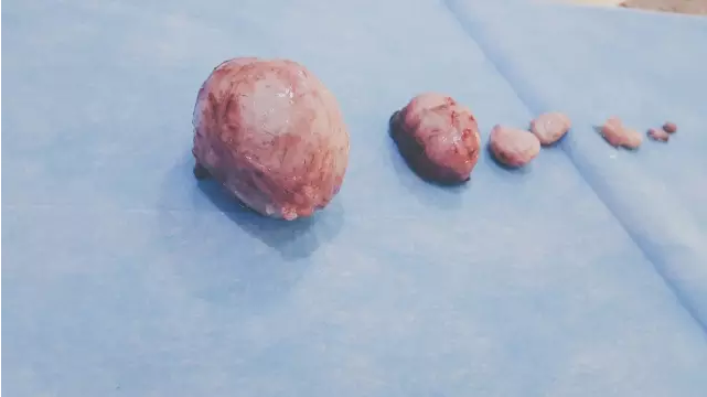 刘总监告诉笔者:“之前做产前检查的时候,就能在腹部摸到肌瘤,只是没想到术中会见到这么多。大大小小共取出8颗瘤子。我们在手术中施行内倒转术,胎儿顺利剖宫产娩出”。