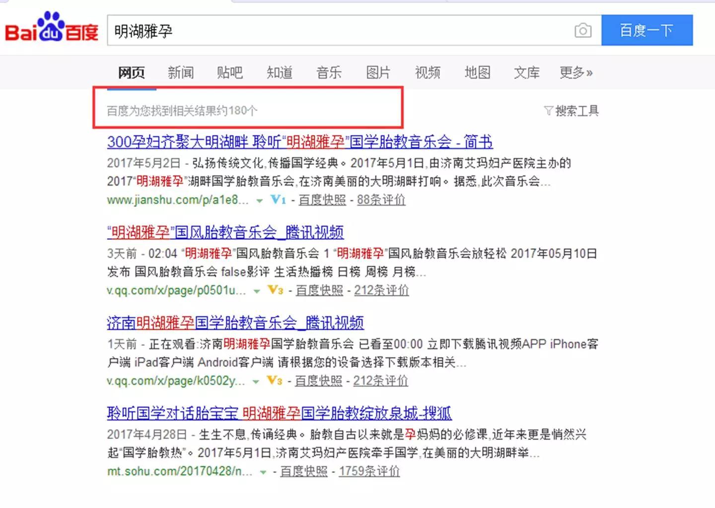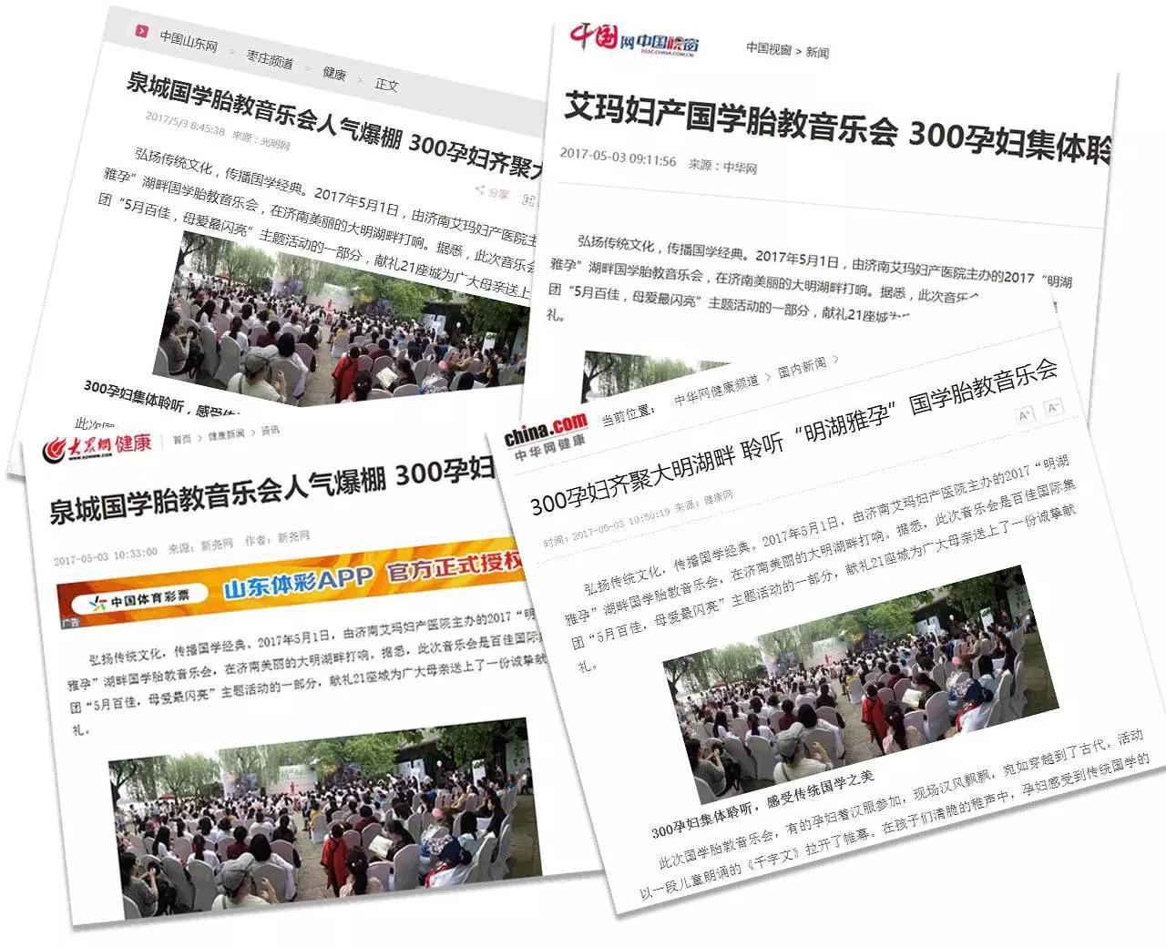 今日头条、搜狐网、腾讯网、凤凰网、新华网、光明网、环球网、中网、中华网、健康报网、大众网、中山东网、齐鲁热线、点资讯,以及北京新闻网、上海新闻网等60多家媒体报道。百度搜索“明湖雅孕”达180条搜索内容,在互联网掀起了学胎教的风潮。