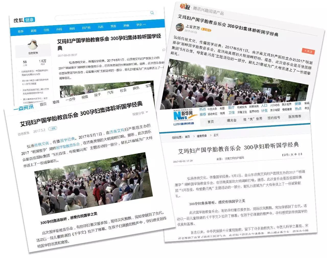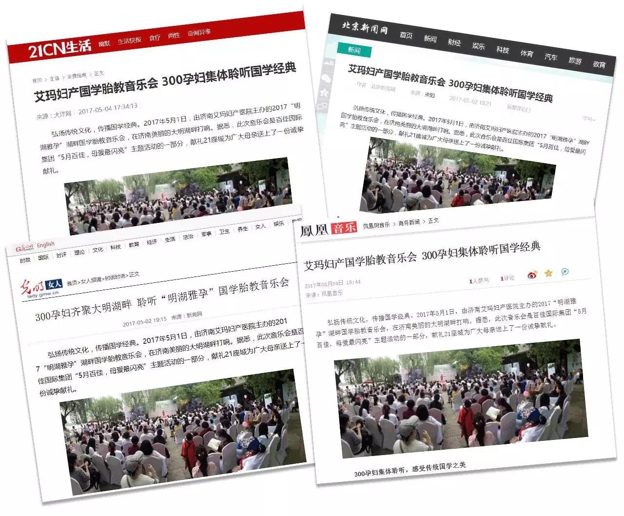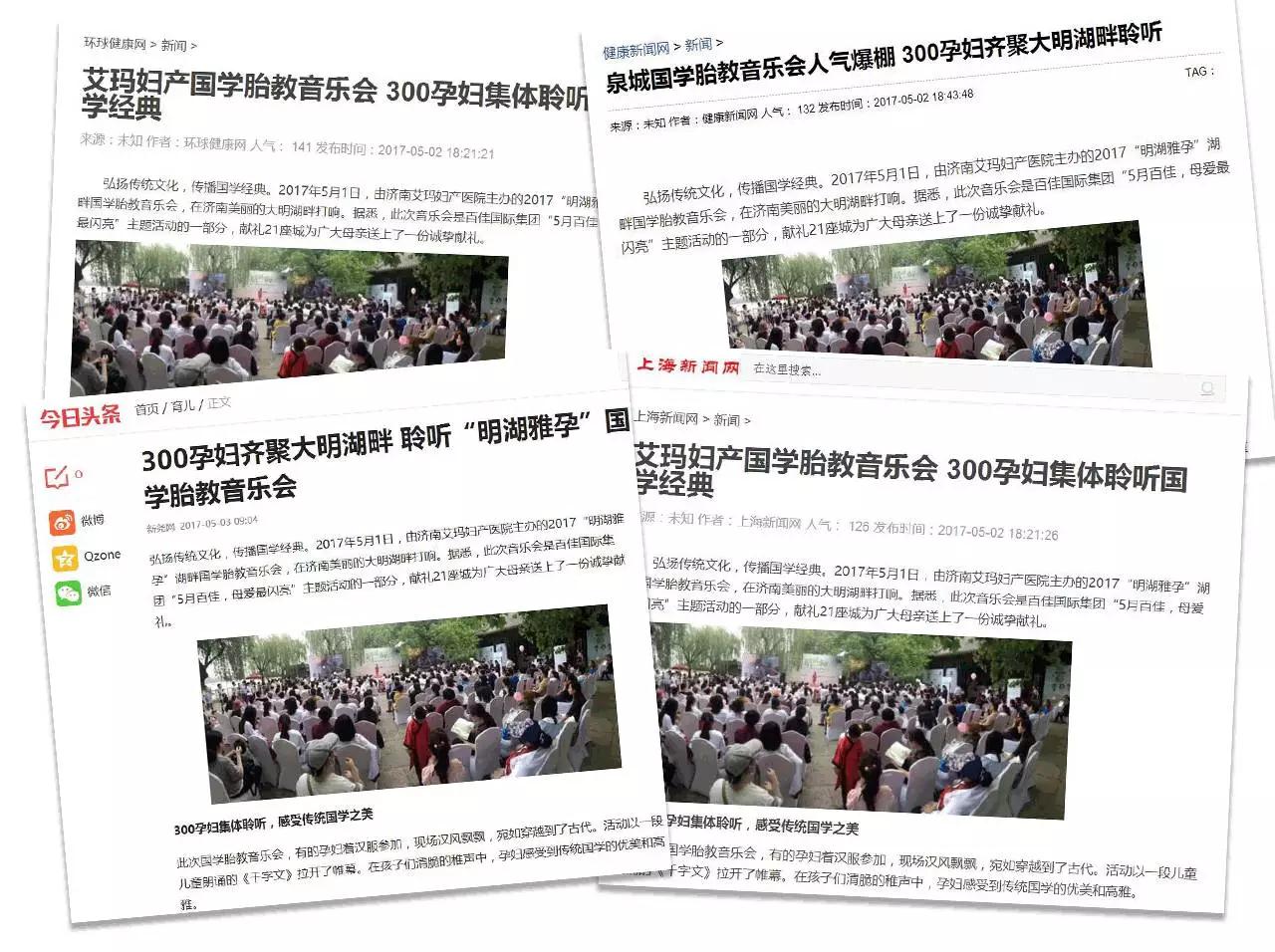 日前,由济南艾玛妇产医院举办的2017“明湖雅孕”湖畔学胎教音乐会在济南大明湖畔举行,开启了学胎教的新篇章。多家媒体对此进行了报道。