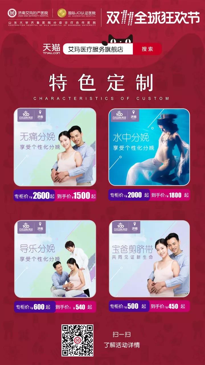 1 淘宝、天猫APP扫描下方二维码或搜索“艾玛医疗服务旗舰店”进入店铺,点击“济南院区”即可进入“济南艾玛妇产医院”查找所需的项目,提前添加至购物车。