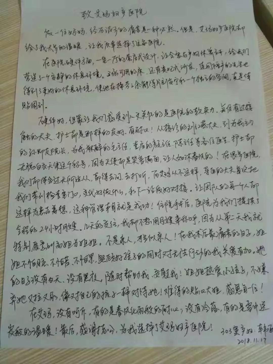 这是高女士送给艾玛的面锦旗,通过电话得知,高女士目前还在月子期。无法亲自赶来送上锦旗,只好托人将这面代表着赤赤诚意的锦旗邮寄过来。小艾在电话采访中得知,高女士是从百度词条了解的艾玛妇产,与韩女士样,都是选择的剖宫产,目前恢复状况良好,母子平安。