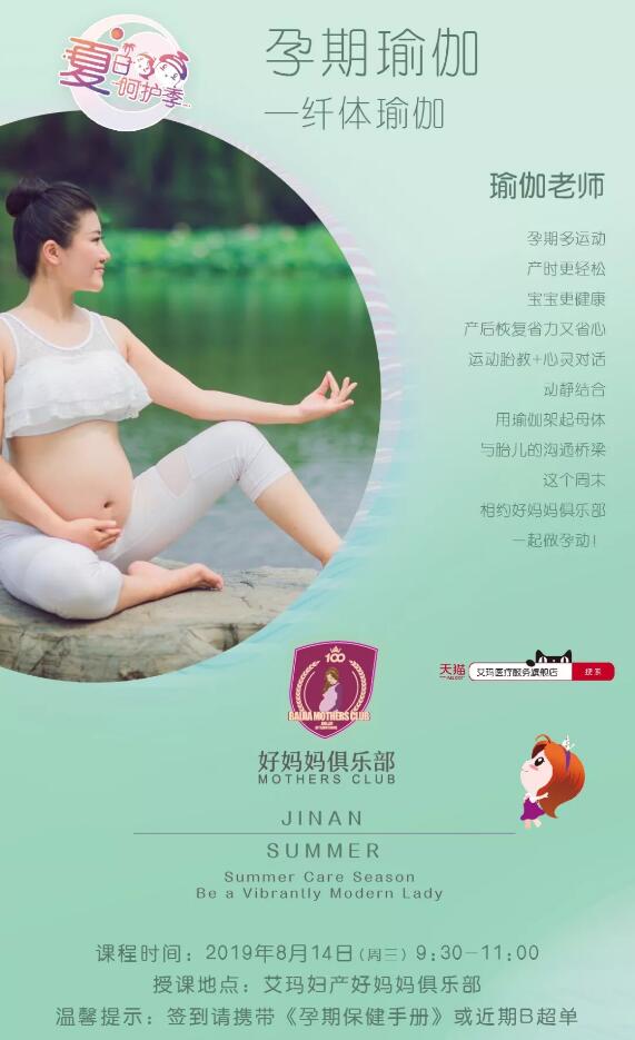 孕期瑜伽,是你不错的选择。方便简单,在呼吸吐纳的过程中舒展身体,宁心静气的同时还能对胎宝进行胎教。8月14日(周三)济南艾玛好妈妈俱乐部为各位宝妈们请来了专业的瑜伽老师,带领大家起“孕”动起来~
