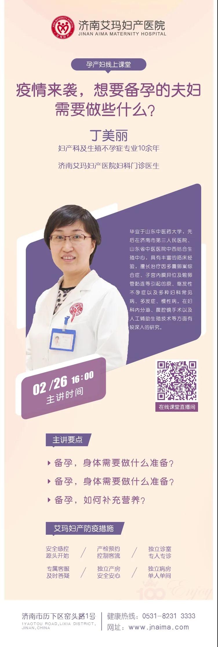 本次直播课程由艾玛妇科门诊医生丁美丽给大家授课,讲解备孕的那些事,想要备孕的夫妻定要准时观看哦~