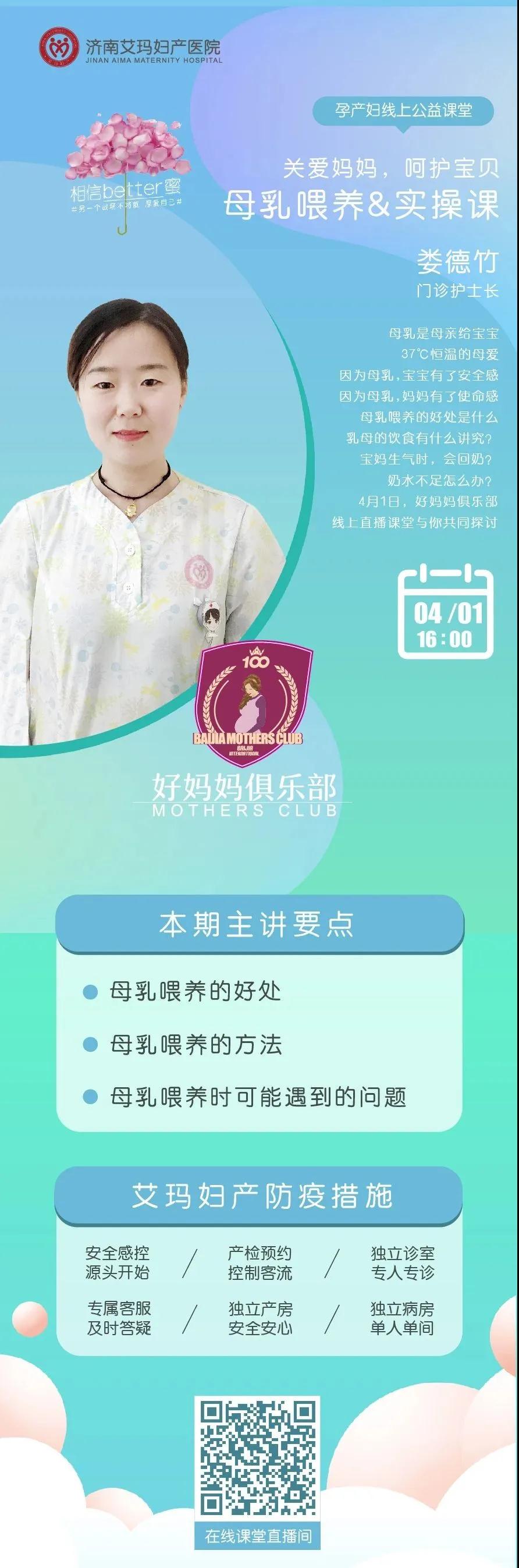 接下来的课程,我们邀请了我们的门诊护士长娄德竹,为大家带来母乳喂养&实操课。母乳喂养的好处有哪些?母乳喂养的姿势有几种?哺乳期乳房护理等等,大家是不是很期待呢?定好小闹钟,4月1日下午4点,我们准时相约,不见不散哦~