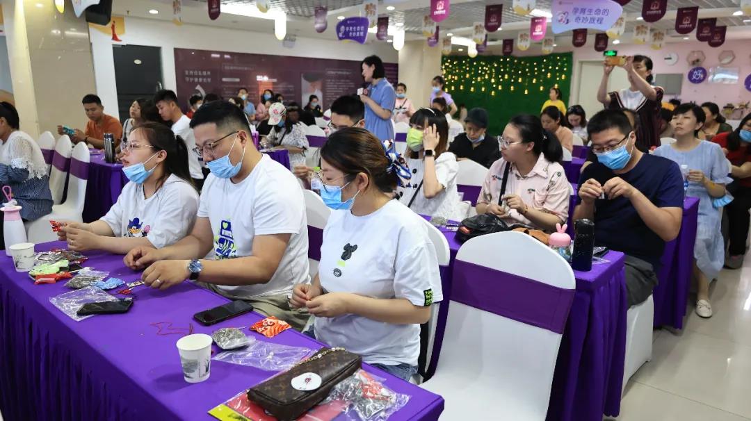 宝妈宝爸们捏起针线,缝缝香包,串串配饰,在手工老师的指导下,细心地制作着五彩斑斓的香包。