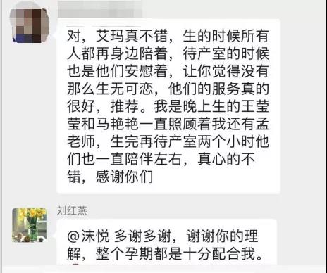 “艾玛真不错,生的时候所有人都在身边陪着,在待产室的时候也是他们安慰着,让你觉得没有那么生无可恋,他们的服务真的很好,推荐。我是晚上生的,王莹莹和马艳艳直照顾着我,还有孟莲老师,生完在待产室两个小时,他们也直陪伴左右,真心地不错,感谢你们!”