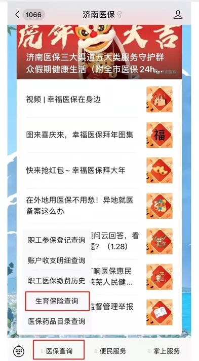 打开微信,搜索并关注“济南医保”微信公众号,找到下方【医保查询】栏目,点击【生育保险查询】按钮;
