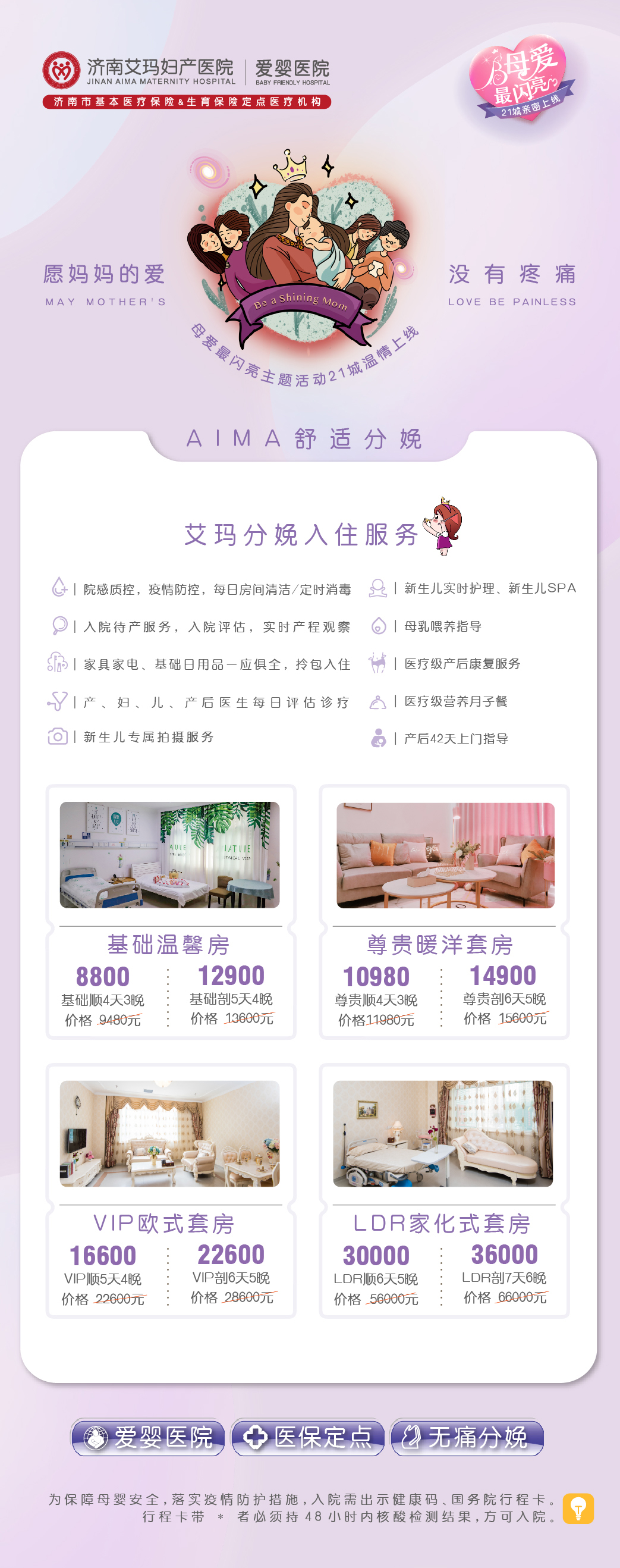 艾玛妇产舒适分娩采用家庭间模式,设有不同面积的套房。套房内独立卫浴、电视、冰箱、陪床以及母婴用品等应俱全,从墙纸搭配到床垫软硬、从灯光柔和度到卫生间内扶手、急救铃、防撞等……每细微处均用心布置,时刻贴心保护宝妈和宝宝。