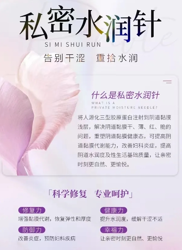 私密水润针将人源化三型胶原蛋白精准注入阴道黏膜浅层。这一神奇物质能与人体相融,大幅提升黏膜代谢能力,改善微循环,增强自我修复力。同时,调节阴道内环境,增强免疫力,筑起病菌防御墙。更关键的是,它显著提升阴道水润度,让亲密时刻重归自然愉悦。